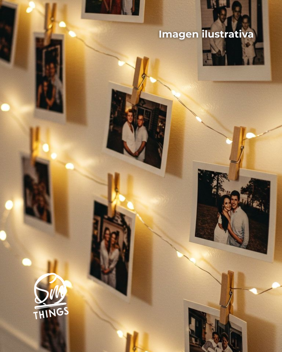 Su tamaño es 10.5 x 9cm aproximadamente en diseño polaroid, vienen en packs con mini broches de 2.5cm y 2 metros de luz alambre led 🥰